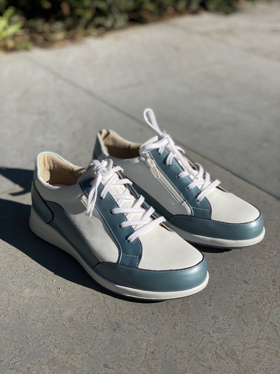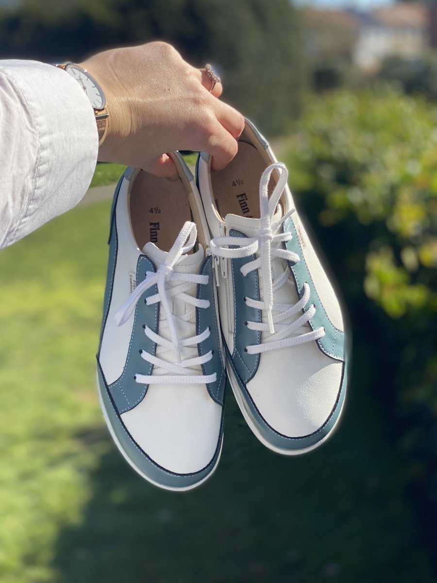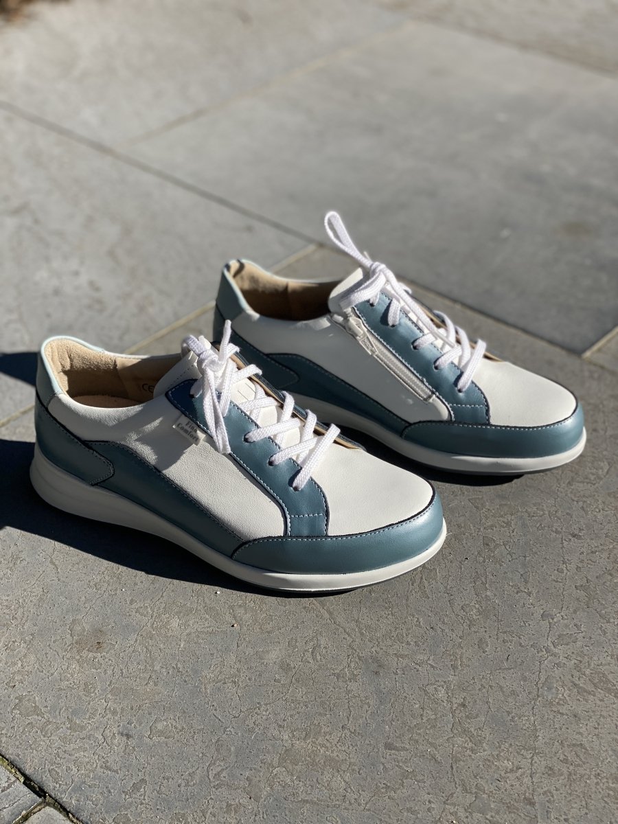 Deze witte sneaker van Finn Comfort met blauwe accenten is een super comfortabel model, dankzij de brede pasvorm. Heb je een brede voet? Dan ga je meteen genieten wanneer je voet in de schoen glijdt. Dankzij de brede vetersluiting, is deze schoen ook ideaal voor mensen met een hoge wreef. De ritssluiting aan de binnenkant van de schoen maakt het extra handig om de schoenen snel aan te trekken. Het voetbed is uitneembaar en loopt extra zacht (FinnMellow zool).