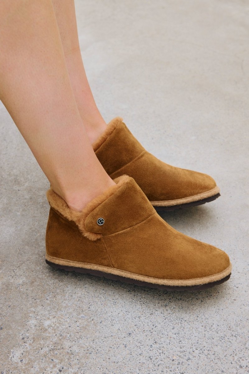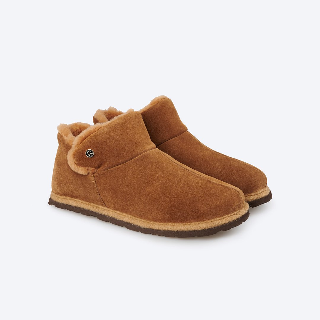 Snel last van koude voeten? Deze cognac-kleurige pantoffels in velours zijn binnenin gevoerd met lamswol (mouton retourné), zodat je de hele winter kan genieten van warme voeten!