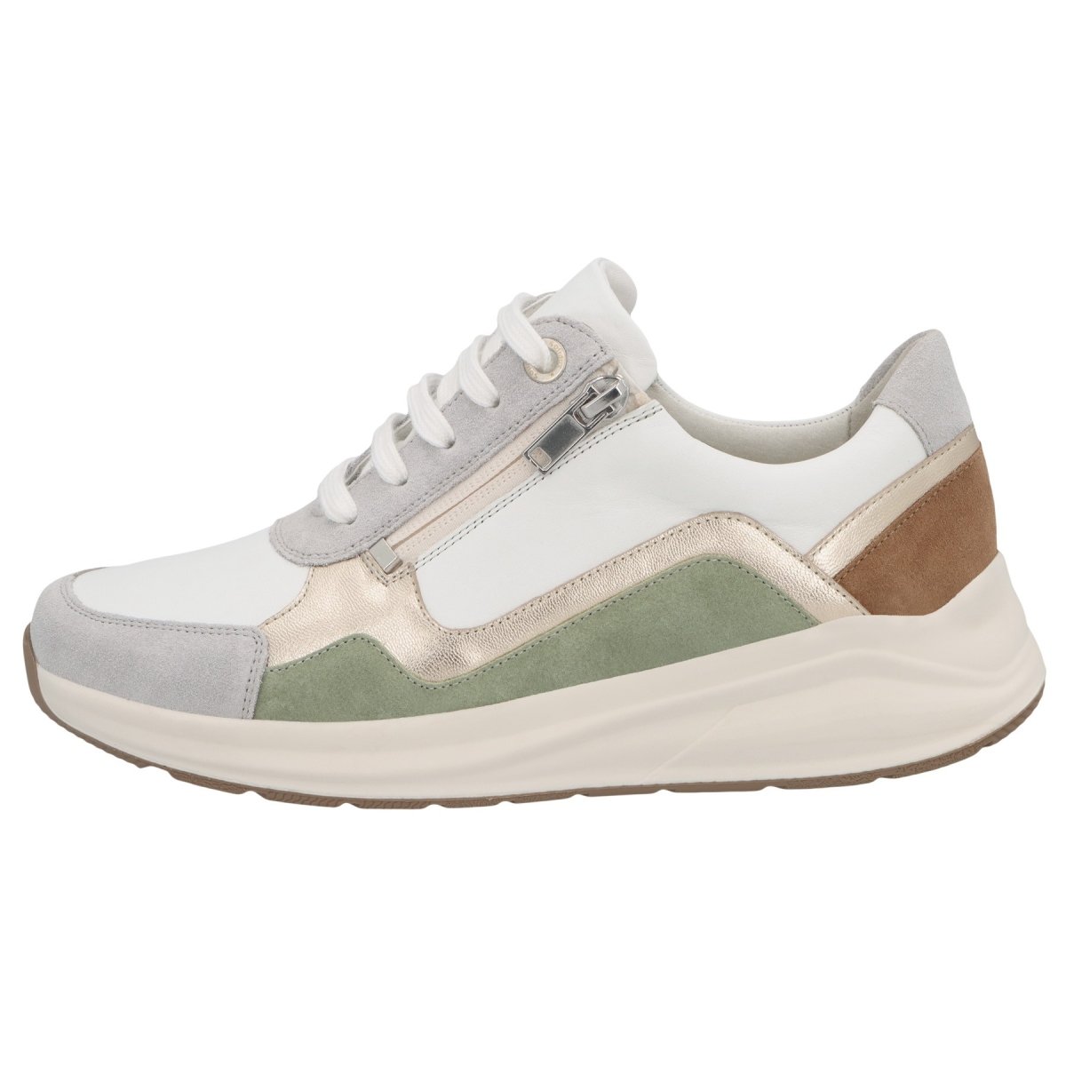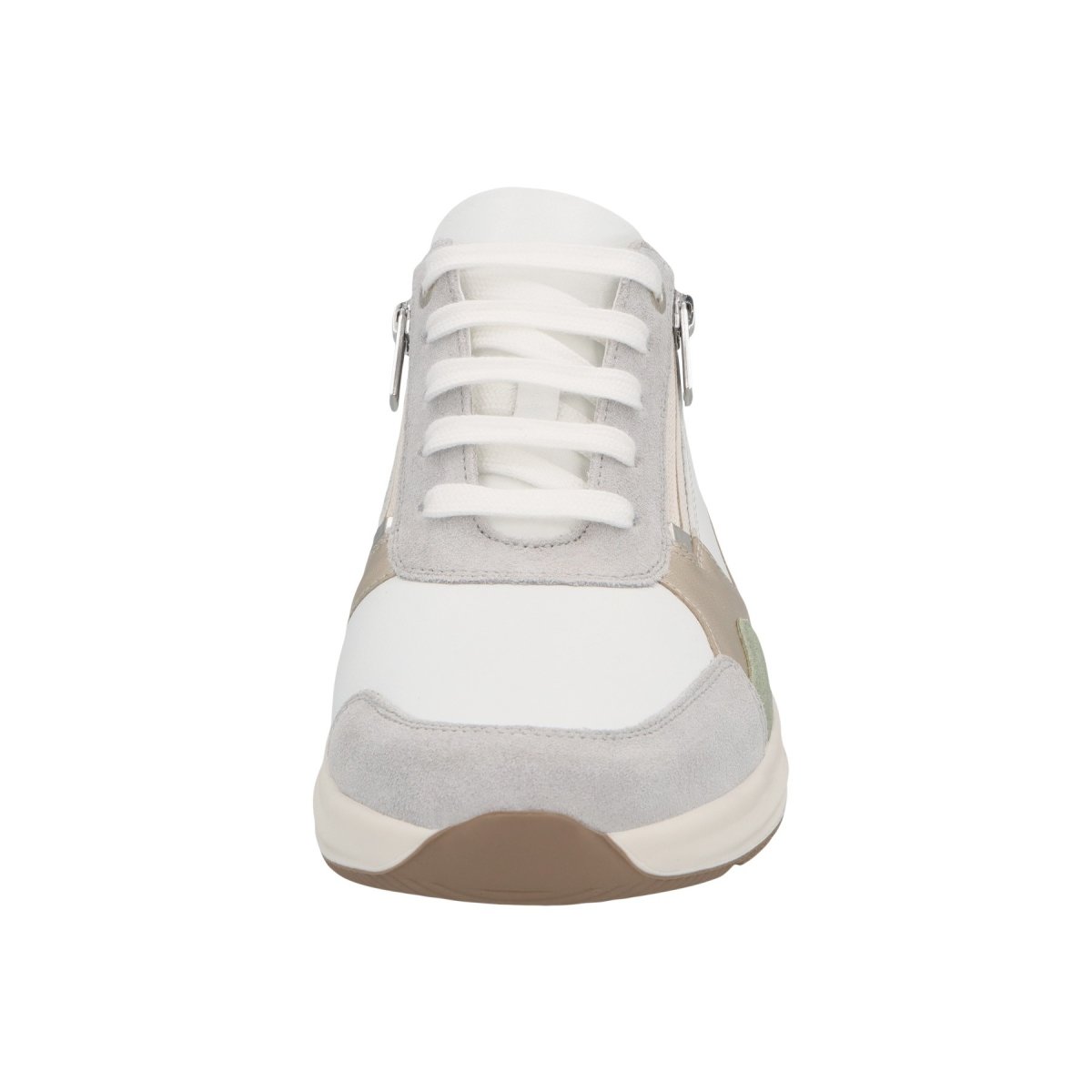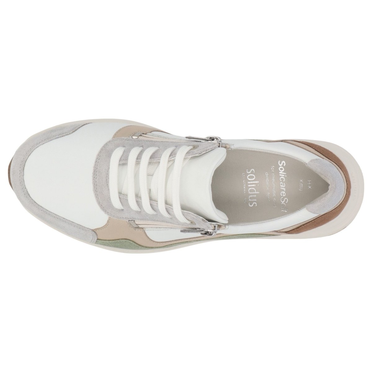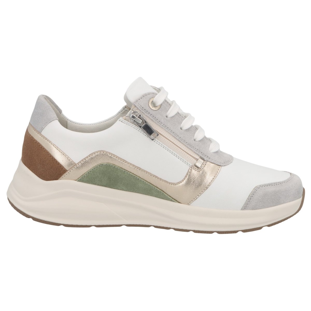 Deze witte sneaker met bronzen en lavendelkleurige accenten is ideaal voor mensen met normale voeten en bredere voeten, doordat de schoen 2 uitneembare voetbedden heeft. De ritssluiting maakt het heel eenvoudig om de schoenen aan en uit te trekken. Voor mensen met knobbels aan de tenen is dit ook een goed model, aangezien er stretchleer gebruikt werd.