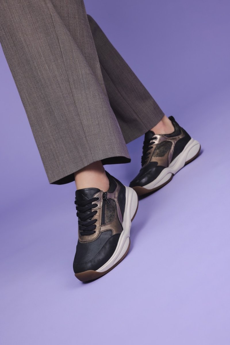 Het gevoel dat je met deze sneaker ervaart is uniek, dit heb je nog nooit gevoelt! De demping van de SWX zolen is gigantisch, dit maakt deze zwarte schoen met bronzen accenten ook geschikt voor mensen met knie- of rugklachten. De ritssluiting biedt je extra comfort.